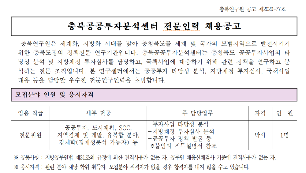 {게시판이름} 상세보기 - 제목, 작성자, 작성일, 조회수, 내용, 첨부파일 정보 제공 [공고 제2020-77호] 충북공공투자분석센터 전문위원 채용 공고 새글핫이슈 작성자 : 관리자 작성일 : 2020.07.13 조회수 : 4,710 첨부파일 [2020-77]충북공공투자분석센터 전문위원 채용 공고문.hwp (84.5K) 응시원서.hwp (52.0K) 이전글 [공고 제2020-78호] 충북미래기획센터 경제동향분석팀 직원(전문연구원) 채용 공고 다음글 [공고 2020-76호] 충북공공투자분석센터 전문위원 채용 1차 합격자 공고 목록