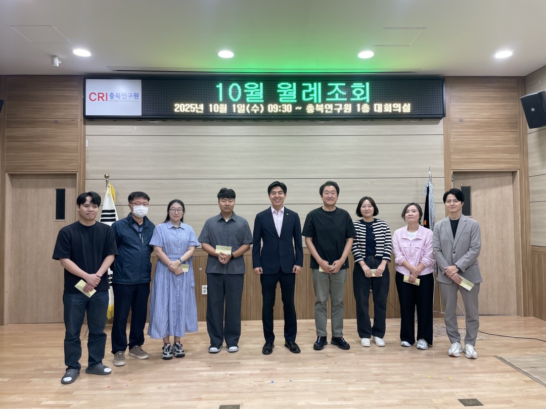 ◎ 일 시 : 2025.10.01.(월) 09:30~ ◎ 장 소 : 충북연구원 1층 대회의 ◎ 내 용 : 10월 직원 생일자 격려, 인사발령, 직원 칭찬릴레이, 2026년 사업계획 수립 업무 연찬회 안내 등 |