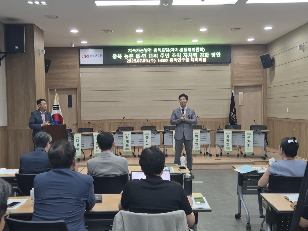 ◎ 일 시 : 2025. 07.09. (수) 14:00~ ◎ 장 소 : 충북연구원 대회의실 ◎ 주 최 : 지속가능발전 충북포럼(자치.공동체위원회) ◎ 주 제 : 충북 농촌 읍.면 단위 주민 조직 자치력 강화 방안 |