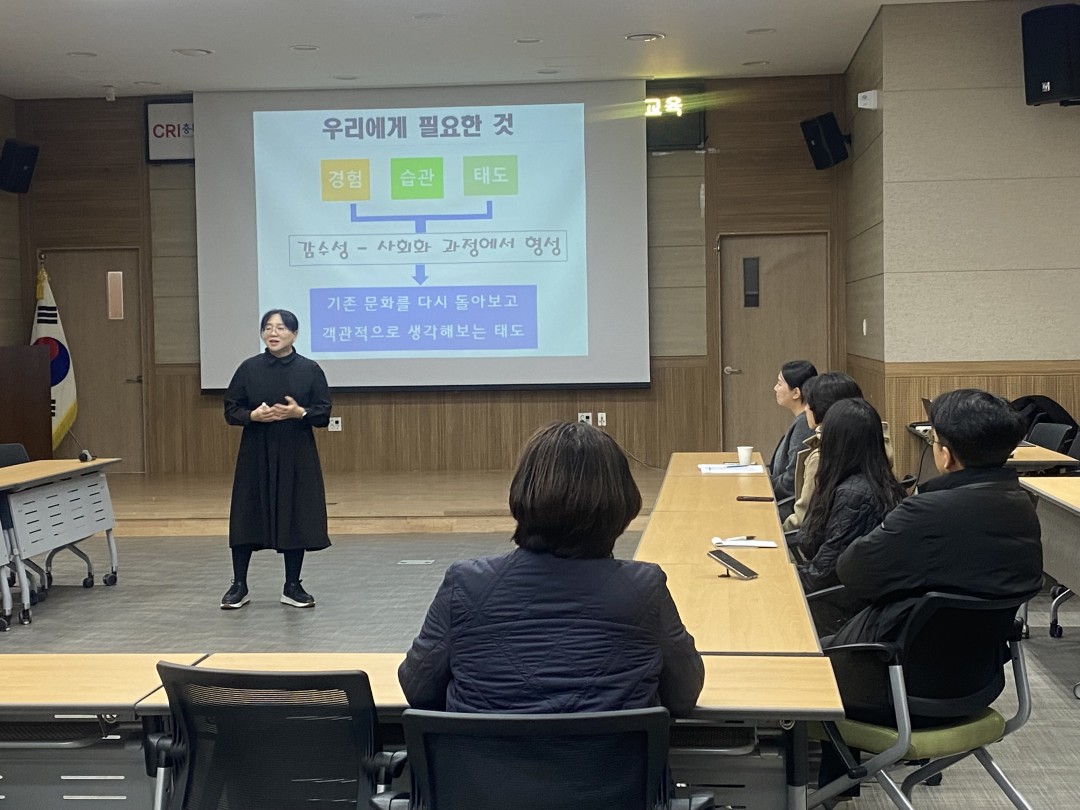 ◎ 일 시 : 2025.12.15.(월) 10:00~12:00 ◎ 장 소 : 충북연구원 1층 대회의실 ◎ 내 용 : 2025년 직장 내 성희롱‧성차별 예방 및 조직 내 성인지 감수성 강화 교육 |