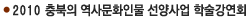 2010³âµµ¿¡´Â ¿ì¸¤(¾ÇÀÎ), ±Ç»óÇÏ(ÇÐÀÚ), ½Åäȣ(»çÇÐÀÚ), È«¹ü½Ä(µ¶¸³¿îµ¿°¡), °¼¼È²(Ȱ¡), ±èµæ½Å(ÇÐÀÚ), ½Å¹Ì´ë»ç(°í½Â), Á¤Áö¿ë(½ÃÀÎ), È«Áø(µ¶¸³¿îµ¿°¡)ÀÌ ¼±Á¤µÇ¾î, ¡º2010 ÃæºÏÀÇ¿ª»ç¹®ÈÀι°¡» Ã¥ÀÚ°¡ ¹ß°£µÇ¾ú½À´Ï´Ù.