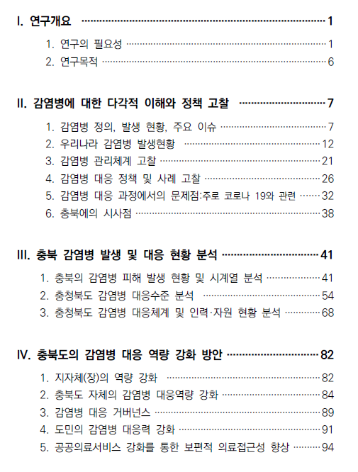 국비사업 및 신규사업 아이템 발굴, 도 현안과제 해결방안 모색 등을 위한 연구과제 입니다. 게시물 검색 등록일순 조회수순 제목연구진 검색 총 109건의 게시물이 있습니다. 2025 2024 2023 2022 2021 2020 2019 2018 2017 2016 게시물 목록 [2020-07] 청주 초정광천수 역사문화 이야기 관련키워드 202007청주초정광천수역사문화이야기 연구진 : 정삼철 발행일 : 2020. 12 조회수 : 2,352 목차 다운로드 [2020-06] 지속가능한 도시재생사업을 위한 마을관리협동조합 운영 방안 연구 관련키워드 202006지속가능한도시재생사업마관리협동조합운영방안연구 연구진 : 변혜선, 류상규, 백민석, 손경주, 홍병곤 발행일 : 2020. 12 조회수 : 2,788 목차 다운로드 [2020-05] 도민공감 저출생 극복방안 관련키워드 202005도민공감저출생극복방안 연구진 : 최용환, 심재승, 조찬주 발행일 : 2020. 12 조회수 : 2,013 목차 다운로드 [2020-04] 지방의회의 변천과 새로운 정책과제 관련키워드 202004지방회변천과새로운정책과제 연구진 : 최용환, 남기헌, 소순창, 하동현 발행일 : 2020. 12 조회수 : 1,966 목차 다운로드 [2020-03] 세종시 집중화 현상 관련 법률 개정방안 관련키워드 202003세종시집중화현상관련법률개정방안 연구진 : 이경기, 조진희, 이유환, 이만형, 이재은, 윤두원, 이진희 발행일 : 2020. 12 조회수 : 2,262 목차 다운로드 [2020-02] 부드러운 충북을 꿈꾸다 관련키워드 202002부드러운충북꿈꾸다 연구진 : 변혜선, 원광희, 남윤명, 김미옥, 김선덕, 염인섭 발행일 : 2020. 12 조회수 : 2,000 목차 다운로드 [2020-01] 코로사사태를 통해 본 충북의 감염병 발생현황과 예방관리 방안 관련키워드 202001코로사사태통해본충북감염병발생현황과예방관리방안 연구진 : 배민기, 최은희, 채수미 발행일 : 2020. 12 조회수 : 2,463 목차 다운로드 [2020-1] (포스트 코로나) 넥스트 노멀 시대, 충북의 대응전략_인쇄본 관련키워드 20201포스트코로나넥스트노멀시대,충북대응전략_인쇄본 연구진 : 충북연구원 [편] 발행일 : 2020.06.15 조회수 : 4,077 목차 제Ⅰ장 팬데믹의 충격 제Ⅱ장 포스트 코로나, 사회변화 전망 제Ⅲ장 넥스트 노멀 시대, 충북의 전략과제 제Ⅳ장 넥스트 충북, 미래 설계 참고문헌 다운로드 [2020-1] 넥스트 노멀 시대, 충북의 대응전략 관련키워드 20201넥스트노멀시대,충북대응전략 연구진 : 충북연구원 편 발행일 : 2020.6 조회수 : 5,082 목차 [충격] 제1장 팬데믹의 충격 제1절 21세기 감염병과 코로나 19 제2절 팬데믹이 불러온 충격 [전망] 제2장 포스트 코로나, 사회변화 전망 제1절 넥스트 노멀시대의 도래 제2절 정부 정책 동향과 시사점 [과제] 제3장 넥스트 노멀 시대, 충북의 전략과제 제1절 산업경제 제2절 고용 일자리 제3절 과학기술 제4절 농축산 제5절 도시공간 제6절 교통물류 제7절 문화관광 제8절 환경 제9절 보건복지 제10절 행재정 [시행] 제4장 넥스트 충북. 미래 설계 제1절 전략방향 설계 제2절 '넥스트 충북'을 위한 제언 다운로드 [2019-9] 보은군 인구정책 현황 분석 및 개선방향 관련키워드 20199보은군인구정책현황분석개선방향 연구진 : 최용환 발행일 : 2019.12. 조회수 : 11,515 목차 다운로드 처음 페이지 이전 페이지 1 2 3 4 5 6 7 8 9 10 다음 페이지 다음 10 페이지 끝 페이지