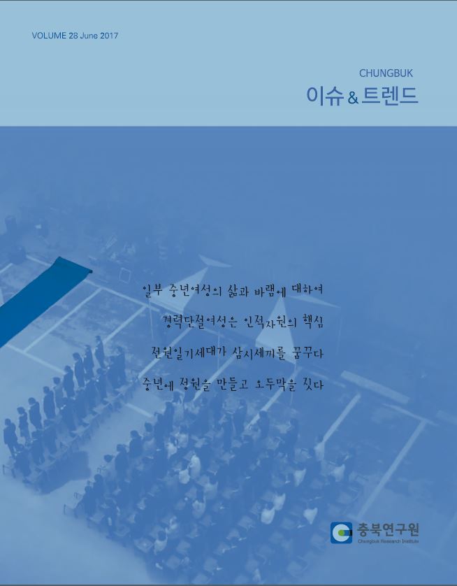 지역연구의 기초자료 제공 및 합리적 정책의사 결정지원을 위한 연구원의 공식 기관지입니다. 게시물 검색 등록일순 조회수순 제목연구진 검색 총 61건의 게시물이 있습니다. 2025 2024 2023 2022 2021 2020 2019 2018 2017 2016 2015 2014 2013 2012 2011 2010 게시물 목록 충북 Issue&Trend (제31호) 관련키워드 충북Issue&Trend(제31호) 연구진 : 발행일 : 2018.03 조회수 : 5,134 목차 권두언 정초시 충북연구원장 ISSUE 2017년 충북 중부지역 홍수피해의 원인과 대응방안 / 배명순 선임연구위원 범죄에 대한 새로운 인식 / 조진희 전문위원, 배민기 연구위원 ’16/’17년 발생한 고병원성 조류인플루엔자(HPAI) 고찰 / 김창섭 충청북도 동물위생시험소장 TREND 충북지역 인구구조 변화 전망과 대응 방향 / 채성주 선임연구위원 고령화와 노년의 사회문제 / 최승호 선임연구위원 인구구조의 변화와 지역의 대응 과제 / 송미령 한국농촌경제연구원 농업·농촌정책연구본부장 REPORT 대청호의 지속가능한 발전을 위한 디딤돌 :생태관광(Eco tourism) / 배명순 선임연구위원, 안주영 연구위원, 성보현 연구위원 오송역에서 출발하는 대륙횡단철도를 꿈꾸며... / 오상진 연구위원, 윤영한 선임연구위원 충북의 인물 황새아빠 “박시룡” 한국교원대 명예교수를 만나다. 연구원 이모저모 다운로드 충북 Issue&Trend (제30호) 관련키워드 충북Issue&Trend(제30호) 연구진 : 발행일 : 2017. 12 조회수 : 4,620 목차 INSIGHT - 世代斷想 : 세대 간 연대와 화해가 필요한 시대 / 김민 교수 (순천향대학교) ISSUE - 충북의 다음세대를 위한 충북연구개발특구 / 안주영 연구위원 (상생발전연구부) - 지진, 이제 남의 일이 아니다 / 배민기 연구위원 (상생발전연구부) - 펫-코노미 시대, 성숙한 반려동물 문하 정착 / 정삼철 수석연구위원 (성장동력연구부) TREND - 어린이 보호구역에 대한 소고 / 정용일 박사 (도로교통공단 충북지부) - 미등록 이주아동 권리보장 / 최은희 연구위원 (사회통합연구부) - 학교 밖 청소년이 웃을 수 있는 사회를 꿈꾸며... / 황미영 공동대표 (충북아동청소년포럼) - 가축 질병과 동물복지 / 우장명 선임연구위원 (성장동력연구부) REPORT - 세계 결찰?소방관들의 축제, 2017 LA World Police and Fire Games / 배명순 선임연귀위원, 성보현 남윤명 연구위원, 조진희 전문위원 - 미래 교통정책 방향 관련 EAST 국제컨퍼런스 출장기 / 윤영한 선임연구위원, 오상진 홍성호 연구위원 - 일본 간사이 지역 의료산업도시 탐방 / 이경기 수석연구위원, 설영훈 연구위원 연구원 이모저모 다운로드 충북 Issue&Trend (제29호) 관련키워드 충북Issue&Trend(제29호) 연구진 : 발행일 : 2017. 09 조회수 : 4,860 목차 INSIGHT - 청년은 우리의 자산 / 남기헌 (충청대학교 교수) ISSUE - 도시재생 뉴딜정책과 충북의 대응 방안 / 변혜선 (공간창조연구부 선임연구위원) TREND - 이 시대의 '충북 청년' / 정수현 (충북지역인적자원개발위원회 책임연구관) - 충북의 청년 일자리 동향과 제언 / 윤창훈 (충청대학교 교수) - 청년창업자, 충주 구도심을 재생하다 / 이상창 (보탬협동조합) - 정치에 무관심한 한국 청년시대 / 이재헌 (우리미래 사무국장) - 헬스클럽에 운동기구가 없다? / 이영락 (MBC충북아나운서, 라디오PD) ATRICLE - 문화영향평가 제도와 개선과제 / 성보현(상생발전연구부 연구위원) LECTURE - 비법과 특효는 없다 : 약이 되는 밥상, 독이 되는 밥상 / 이계호 (충남대 화학과 명예교수) REPORT - 일본의 문화예술 현장을 걷다 / 김양식 사회통합연구부 수석연구위원 - 중남미 물류 관련 해외사례 조사를 마치며... / 오상진, 홍성호 연구위원, 윤영한 선임연구위원 연구원 이모저모 다운로드 충북 Issue & Trend (제28호) 관련키워드 충북Issue&Trend(제28호) 연구진 : 발행일 : 2017.06 조회수 : 4,858 목차 권두언 - 새 정부에 바란다 / 김승환 이슈 (출범) - 문재인 정부의 출범과 충북발전 / 원광희 - 신 정부 출범과 충북의 교통정책 / 오상진 트렌드 (중년) - 일부 중년여성의 삶과 바램에 대하여 / 김규원 - 평생교육을 통한 제2의 인생설계 / 남윤명 - 경력단절여성은 인적자원의 핵심 / 최은희 - 중년의 새로운 삶 : 전원일기세대가 심시세끼를 꿈꾸다 / 변혜선 - 중년에 정원을 만들고 오두막을 짓다 / 최영락 특강&출장 - 현대철학의 예술적 사용 / 김규원 - 제4차 산업혁명, 그 혁신의 발상지 실리콘 밸리 / 정초시, 함창모, 설영훈 - 태국과 베트남 도시 문화 탐방 / 이경기, 김양식 연구원 이모저모 다운로드 충북 Issue & Trend (제27호) 관련키워드 충북Issue&Trend(제27호) 연구진 : 발행일 : 2017.03 조회수 : 5,082 목차 INSIGHT - 변화에 대한 두려움을 극복하자 / 정초시 (충북연구원장) ISSUE - 충북미래비전2040 수립 / 함창모 (미래전략실장) - 미래 연구방법론 / 박병원 (STEPI 미래연구센터장) TREND - 노년에 대한 인식전환 / 최승호 (사회통합연구부 선임연구위원) - 농촌 노인주거의 대안 : 공동생활홈 개선 및 공공의 역할 모색 / 변혜선 (공간창조연구부 연구위원) - 농촌형 교통복지 : 새로운 도전과 과제 / 원광희 (남.북부 총괄분원장) - 충북의 고령친화산업 전망 및 제언 / 윤영한 (성장동력연구부 연구위원) INTERVIEW&REPORT - 인터뷰_ 어른 대전은 나중에 / 이충원 (청주시정정책자문단장) - 출