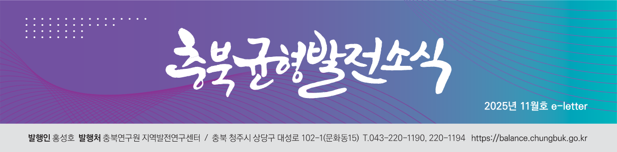 발간물박스 전체발간물충북균형발전 소식 게시물 검색 등록일순 조회수순 제목연구진 검색 총 116건의 게시물이 있습니다. 2025 2024 2023 2022 2021 2020 2019 2018 2017 2016 2015 2014 2013 2012 2011 2010 게시물 목록 충북균형발전소식 (2025. 11.) 관련키워드 지방시대엑스포정책토론회국가균형발전균형발전사업행복마사업정책포럼옥천로컬푸드직매장도안복합문화공간지역발전연구센터 연구진 : 지역발전연구센터 발행일 : 2025.11. 조회수 : 56 목차 01 중앙정부 정책동향# 2025 대한민국 지방시대 엑스포 개최02 충북의 대응방안# 국가균형발전 대전환 필요성 강조# 2025 균형발전사업 표창# 2025년 행복마을사업 자문회의# 제2차 이니셔티브 정책포럼03 충북 지역균형발전사업 추진동향# [옥천군] 옥천로컬푸드직매장 매출 350억, 방문객 120만명# [증평군] 도안 복합문화공간 조성완료 다운로드 충북균형발전소식 (2025. 10.) 관련키워드 인구감소지역행복마사업경연대회충청광역공동지역화폐균형발전소식충북소방교육대일라이트표준화월류봉출렁다리행복돌봄센터별곡공용주차장지역발전연구센터 연구진 : 지역발전연구센터 발행일 : 2025.10. 조회수 : 263 목차 01 충북의 대응방안# 충북도, 인구감소지역에 새로운 '숨'을 불어 넣다!# 2025 충청북도 행복마을사업 경연대회 개최# 충청광역연합 공동 지역화폐 도입 검토02 충북 지역균형발전사업 추진동향# [보은군] 충북소방교육대 유치 준비 순항# [영동군] 일라이트 표준화 지원시스템 구축# [영동군] 월류봉 출렁다리 착공# [증평군] 행복돌봄센터 건립 본격화# [단양군] 별곡 공용주차장 준공 대한민국의 중심 충북 균형발전 (제42호) 관련키워드 동해정약용도서관청년창농타운충북지역발전정책취약지역생활여건농촌공간재구조화지역개발사업지역균형발전사업충북균형발전정책지역발전연구센터 연구진 : 지역발전연구센터 발행일 : 2025.09. 조회수 : 331 요약 「대한민국의 증심, 충북 균형발전」에서는 지역균형발전사업 추진을 통해 조성된 시설 전경을 표지로 게재합니다. 본 사진은 2021년 기반조성사업으로 선정돼 현재 공정률 95%, 올해 12월 개통을 목표로 조성 중인 시루섬 생태공원 진입 교량사업(시루섬 기적의 다리)의 모습입니다. 목차 01_기획특집- 언제든 훌쩍 떠나고 싶은 관광도시, 별천지 동해- 문화와 지성이 공존하는 곳, 정약용도서관- 청년 농업의 빛, 청년창농타운02_2025 지역발전정책 정보(3분기)- 중앙정부 정책동향- 충북의 대응방안- 충북 지역균형발전사업 추진동향03_지역발전 관련 용어사전- 취약지역 생활여건 개조사업- 농촌공간 재구조화 및 재생사업- 지역개발사업04_지역발전연구센터 상반기 추진사항- 2025 균형발전 업무담당자 워크숍 추진 다운로드 카드뉴스_7호 #보은군 관련키워드 충북지역균형발전사업보은군속리산자생야행화식물원동부일반산업단지스포츠파크속리산휴양관광지농촌체엄관속리산사계절전천후훈련장결초보은체육관뱃들놀이터속리산말 연구진 : 지역발전연구센터 발행일 : 2025.08. 조회수 : 265 목차 다운로드 충북균형발전소식 (2025. 08.) 관련키워드 이재명정부광역투어패스지역수요맞춤지원사업보은전지훈련지증평힐링여행단양다누리아쿠아리움확장단양시루섬기적다리균형발전소식지역발전연구센터 연구진 : 지역발전연구센터 발행일 : 2025.08. 조회수 : 484 목차 01 중앙정부 정책동향# 국정기획위, 이재명 정부의 국정 청사진 제시02 충북의 대응방안# 충청권 4개 시·도 '광역투어패스' 본격 운영# 2025 지역수요맞춤지원사업 영동·단양군 선정02 충북 지역균형발전사업 추진동향# [보은군] 하계 전지훈련지 대박 행진# [증평군] 도심 속 짧은 힐링여행# [단양군] 다누리아쿠아리움 확장 개장# [단양군] 시루섬 기적의 다리 완공 임박 다운로드 충북균형발전소식 (2025. 07.) 관련키워드 미래전략토론회영동일라이트매장량평가영동레인보우힐링센터증평창동개나리어울림센터증평복합문화예술회관괴산동진천자연울림음악분수괴산선유동신선길단양다누리아쿠아리 연구진 : 지역발전연구센터 발행일 : 2025.07. 조회수 : 516 목차 01 충북의 대응방안# 충북연구원 '민선8기 4년차와 미래전략 토론회' 개최02 충북 지역균형발전사업 추진동향# [영동군] 일라이트 매장량 평가# [영동군] 레인보우 힐링센터# [증평군] 창동개나리 어울림센터# [증평군] 복합문화예술회관 건립# [괴산군] 동진천 자연울림 음악분수# [괴산군] 선유동 신선길 조성# [단양군] 다누리아쿠아리움 재개관# [단양군] 다리안관광지 '캠핑 워케이션' 다운로드 대한민국의 중심 충북 균형발전 (제41호) 관련키워드 정주여건지역산업지역발전정책균형발전특별회계사업지역균형발전사업충북균형발전정책지역발전연구센터 연구진 : 지역발전연구센터 발행일 : 2025.06. 조회수 : 574 요약 「대한민국의 증심, 충북 균형발전」에서는 지역균형발전사업 추진을 통해 조성된 시설 전경을 표지로 게재합니다. 본 사진은 2022년 기반조성사업으로 선정돼 2025년 5월 영동군 레인보우힐링관광지 내 조성된 '레인보우 힐링 숲 가족놀이공원'의 모습입니다. 목차 기획특집- 지역균형발전사업이 변화시킨 충북