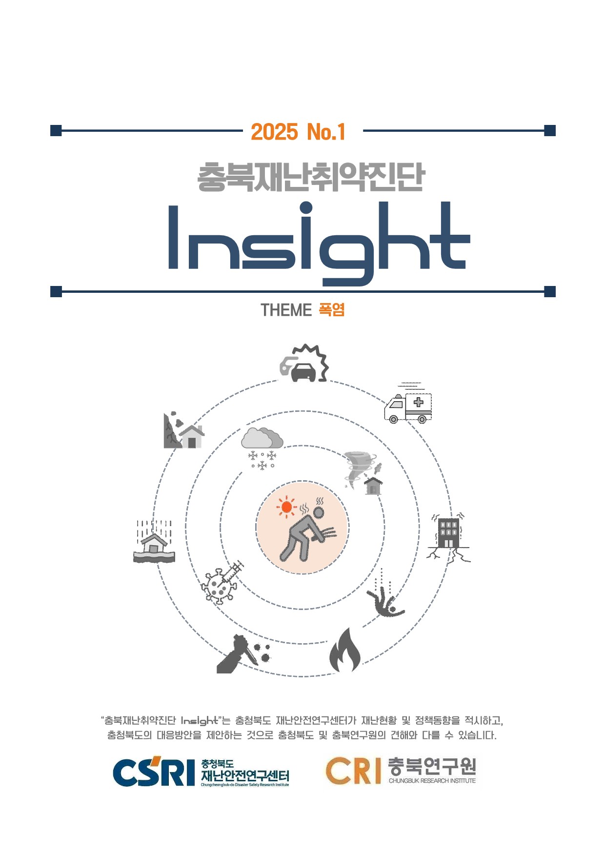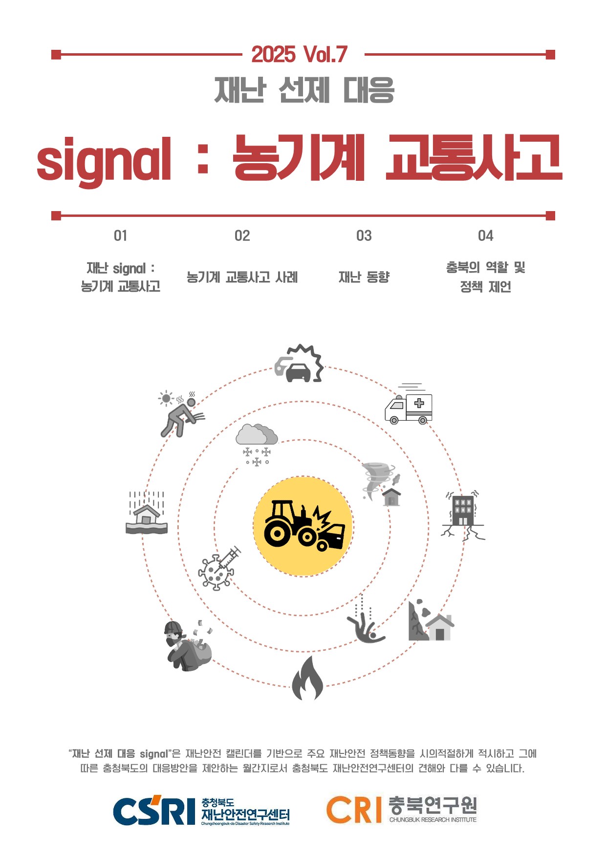 발간물박스 전체안전충북포커스재난안전브리프재난안전정책연구충북재난취약진단INSIGHT재난선제대응Signal CRI연구원들이 각 분야의 전문보고서를 제공합니다. 게시물 검색 등록일순 조회수순 제목연구진 검색 총 163건의 게시물이 있습니다. 2025 2024 2023 2022 2021 2020 2019 2018 2017 2016 게시물 목록 2025년 제9호 시그널 Signal [다중이용시설 사고] 관련키워드 다중이용시설화재예방수칙재난동향재난안전 연구진 : 충청북도 재난안전연구센터 발행일 : 2025.09. 조회수 : 90 요약 "재난 선제 대응 Signal"은 재난안전 캘린더를 기반으로 주요 재난안전 정책동향을 시의적절하게 적시하고 그에 따른 충청북도의 대응방안을 제안하는 월간지로서 충청북도 재난안전연구센터의 견해와 다를 수 있습니다. 목차 01 재난 : 다중이용시설 사고 ···· 01 다중이용시설 사고란 ······························································· 02 다중이용시설 사고 현황 ·························································· 0402 다중이용시설 사고 사례 ··················· 06 경주 영화관서 불 … 관람객들 긴급대피 ··································· 07 인천 10층짜리 요양병원 건물서 불 … 50대 입소자 2도 화상 ···· 08 영동 한 목욕탕서 불 … 7천600만원 피해 ································ 09 강남소방서, 고등학교 화재 신속 진압 ········································ 1003 재난 동향 ················································ 11 중앙부처 동향 ·········································································· 12 지방자치단체 동향 ··································································· 16 충청북도 동향 ·········································································· 2204 충북의 역할 및 정책 제언 ············· 24 충북의 역할 ············································································· 25 정책 제언 ················································································· 26부록 다중이용시설 국민 행동요령참고문헌 다운로드 2025년 제8호 시그널 Signal [벌쏘임·뱀물림 사고] 관련키워드 벌쏘임뱀물림예방수칙재난동향재난안전 연구진 : 충청북도 재난안전연구센터 발행일 : 2025.08. 조회수 : 218 요약 "재난 선제 대응 Signal"은 재난안전 캘린더를 기반으로 주요 재난안전 정책동향을 시의적절하게 적시하고 그에 따른 충청북도의 대응방안을 제안하는 월간지로서 충청북도 재난안전연구센터의 견해와 다를 수 있습니다. 목차 01 재난 signal : 벌쏘임 뱀물림 사고 ····· 01 벌쏘임 · 뱀물림 사고란 ···························································· 02 벌쏘임 사고 현황 ···································································· 03 뱀물림 사고 현황 ···································································· 0502 벌쏘임 뱀물림 사고 사례 ······················· 06 광양서 벌집 제거하다 말벌 쏘인 50대 병원이송 ················ 07 가을철 강원서 '뱀 물림' 사고 속출, 강원소방 “즉시 119 신고를” ······ 08 교회 신발장 안 뱀에 '화들짝' … 대전서 잇단 뱀 출몰 · 물림 신고 ···· 09 60대 기간제 근로자 '벌쏘임 쇼크사' … 울주군 "유족 적극 지원" ···· 10 산책하다 벌쏘임 봉변 60대, 의식 잃어 병원 이송 ············ 1103 재난 동향 ················································· 12 중앙부처 동향 ······································································· 13 지방자치단체 동향 ································································· 1704 충북의 역할 및 정책 제언 ············· 22 충북의 역할 ··········································································· 23 정책 제언 ··············································································· 24부록 - 벌쏘임 안전수칙 뱀물림 안전수칙참고문헌 다운로드 2025년 제7호 시그널 Signal (농기계 교통사고) 관련키워드 농기계교통사고경운기사고예방수칙재난동향재난안전 연구진 : 충청북도 재난안전연구센터 발행일 : 2025.07. 조회수 : 272 요약 "재난 선제 대응 Signal"은 재난안전 캘린더를 기반으로 주요 재난안전 정책동향을 시의적절하게 적시하고 그에 따른 충청북도의 대응방안을 제안하는 월간지로서 충청북