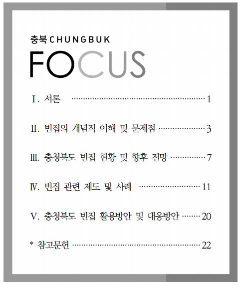 {게시판이름} 상세보기 - 제목, 작성자, 작성일, 조회수, 내용, 첨부파일 정보 제공 [충북 Focus 181호] 충청북도 빈집 현황진단 및 대응방안 새글핫이슈 작성자 : 관리자 작성일 : 2020.07.10 조회수 : 4,899 첨부파일 [포커스]181호 표지포함-게시용.pdf (3.1M) 이전글 [충북 Focus 182호] 충북 노인학대 현황과 대응 방향 다음글 [충북 Focus 180호] 포스트 코로나 시대, 충북의 연구개발서비스업 활용 및 육성 방향 목록