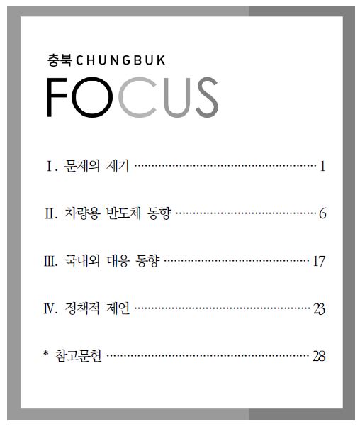 {게시판이름} 상세보기 - 제목, 작성자, 작성일, 조회수, 내용, 첨부파일 정보 제공 [충북 FOCUS 제189호] 최근 차량용 반도체 사태가 충북에 주는 시사점 새글핫이슈 작성자 : 관리자 작성일 : 2021.05.11 조회수 : 2,903 첨부파일 포커스 189호 최종메일링 요청용.pdf (3.2M) 이전글 [충북 FOCUS 제190호] 방사광가속기 국내·외 현황 및 활용 활성화 방안: 바이오 분야를 중심으로 다음글 [충북 FOCUS 제188호] 2019년 GRDP로 본 충북경제 목록