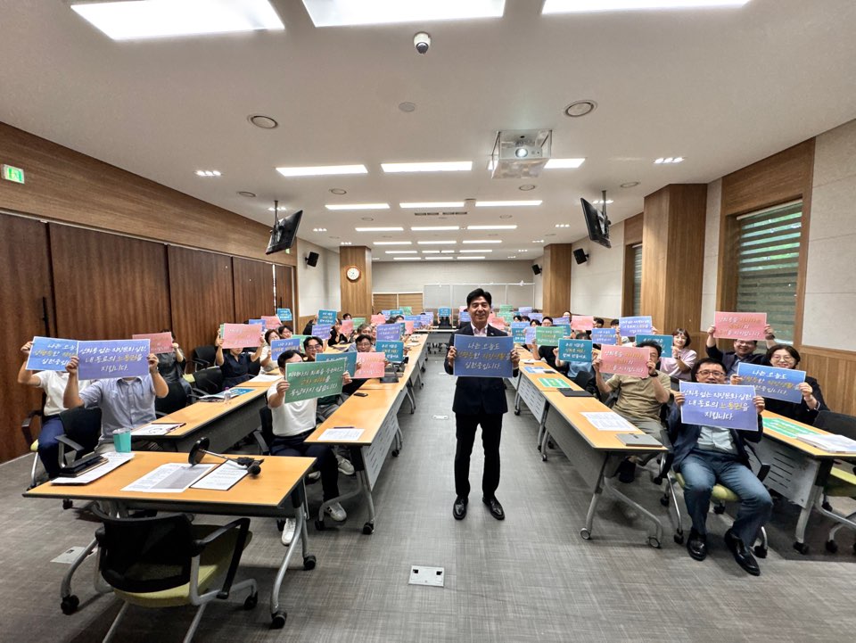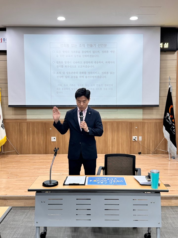 ◎ 일 시 : 2025.09.01.(월) *월례 조회시 진행 ◎ 장 소 : 충북연구원 1층 대회의실 ◎ 주 최 : 충북연구원/충북연구원 여직원협의회 ◎ 내 용 : - 기관장 주관 "성희롱 없는 조직 만들기" 선언문 낭독 - 성희롱 예방 및 근절 동참 인증사진 촬영(피켓활용) - 연구원 홈페이지 게시, SNS 및 언론보도 등 대외 홍보 |