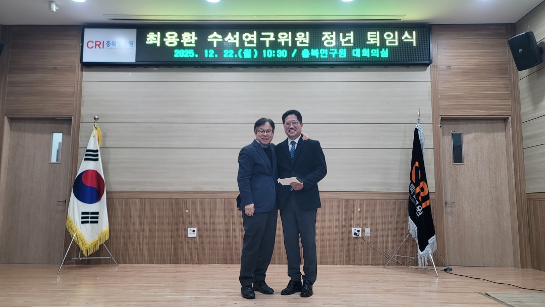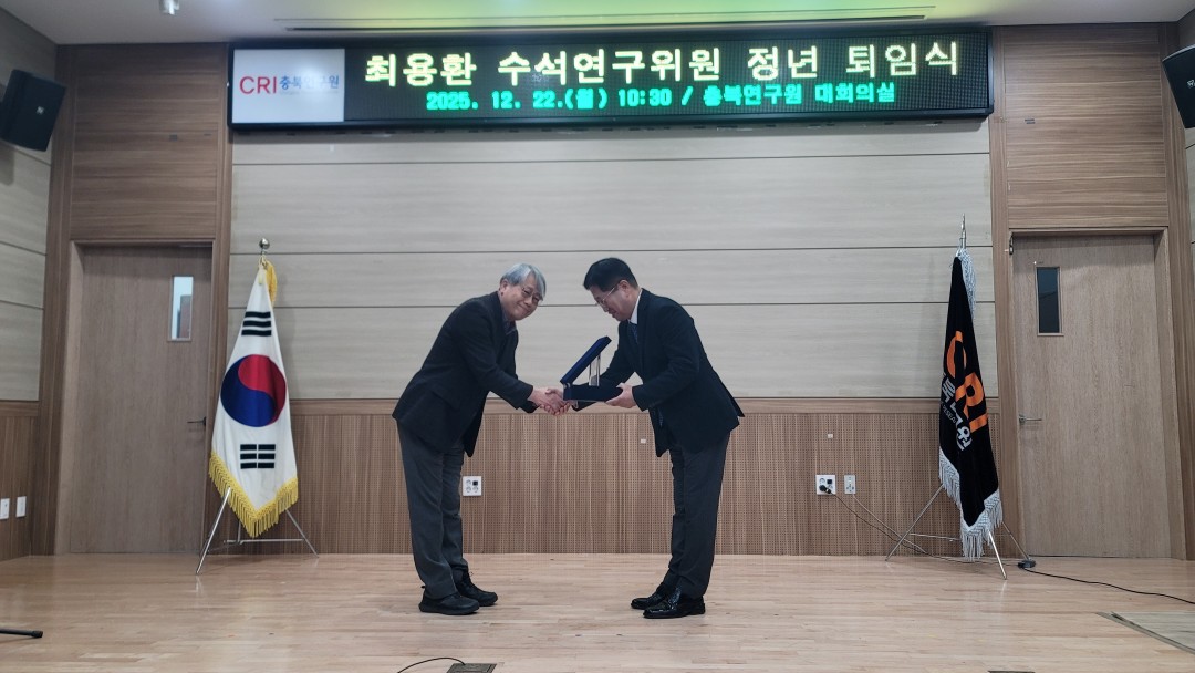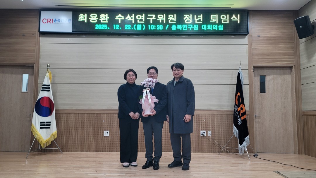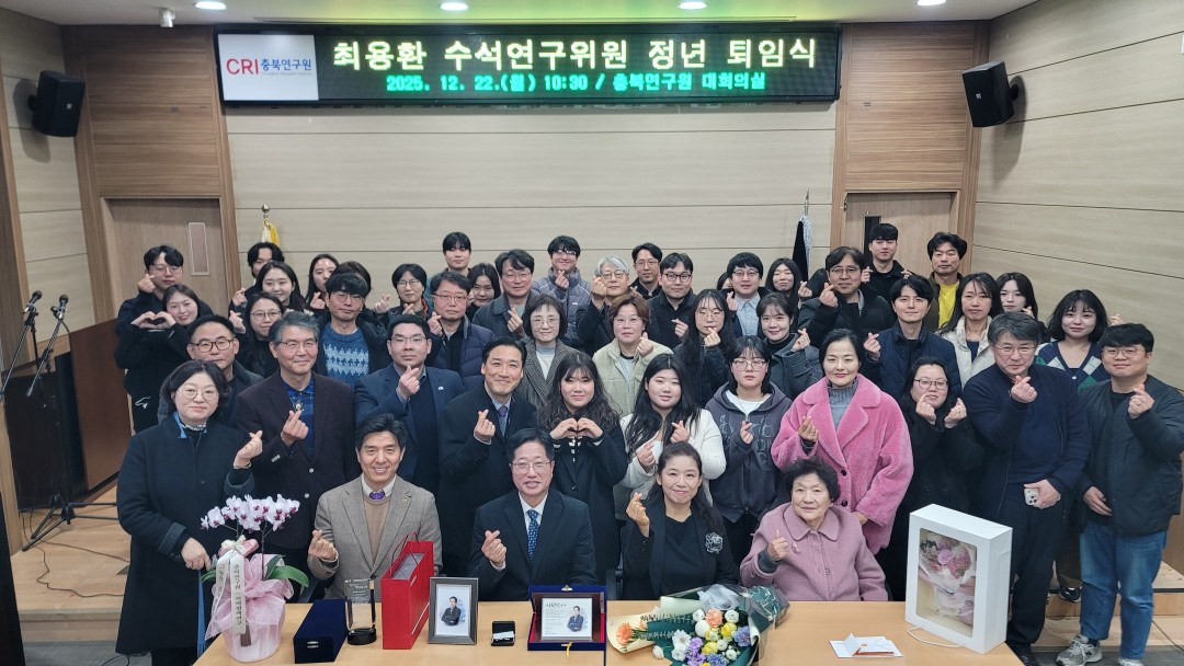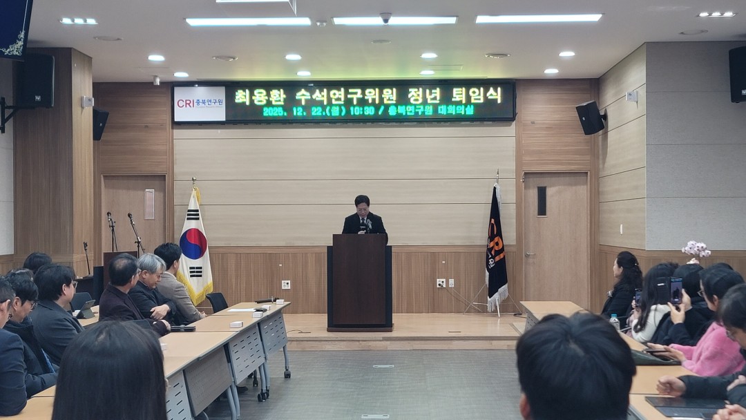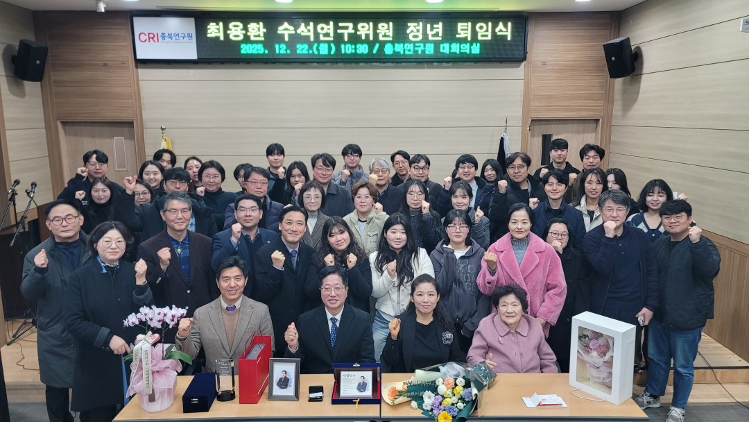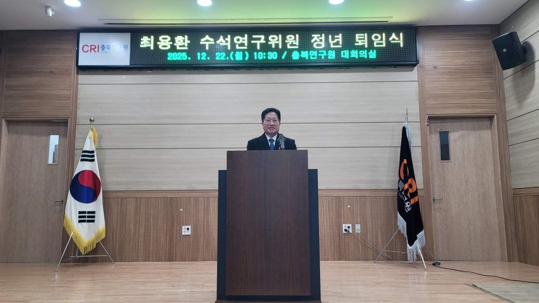 {게시판이름} 상세보기 - 제목, 작성일, 조회수, 사진 정보 제공 2025.12.22. 최용환 수석연구위원 정년 퇴임식 새글핫이슈 작성일 : 25-12-24 11:24 조회수 : 113 사진 : 14 ◎ 일 시 : 2025.12.22.(월) 10:30◎ 장 소 : 충북연구원 1층 대회의실◎ 내 용 : 최용환 수석연구위원 정년 퇴임식 {게시판이름} 상세보기 - 첨부파일 정보 제공 첨부파일 251222_최용환 박사님 정년퇴임식 00.jpg 251222_최용환 박사님 정년퇴임식 01.jpg 251222_최용환 박사님 정년퇴임식 03.jpg 251222_최용환 박사님 정년퇴임식 04.jpg 251222_최용환 박사님 정년퇴임식 05.jpg 251222_최용환 박사님 정년퇴임식 06.jpg 251222_최용환 박사님 정년퇴임식 07.jpg 251222_최용환 박사님 정년퇴임식 08.jpg 251222_최용환 박사님 정년퇴임식 09.jpg 251222_최용환 박사님 정년퇴임식 10.jpg 251222_최용환 박사님 정년퇴임식 11.jpg 251222_최용환 박사님 정년퇴임식 12.jpg 251222_최용환 박사님 정년퇴임식 13.jpg 251222_최용환 박사님 정년퇴임식 14.jpg 이전글 2025.12.22. 2025년 2차 충북 농정포럼 개최 다음글 2025.12.18. 충북연구원 북부분원 충북 북부권 지역발전을 위한 세미나 목록