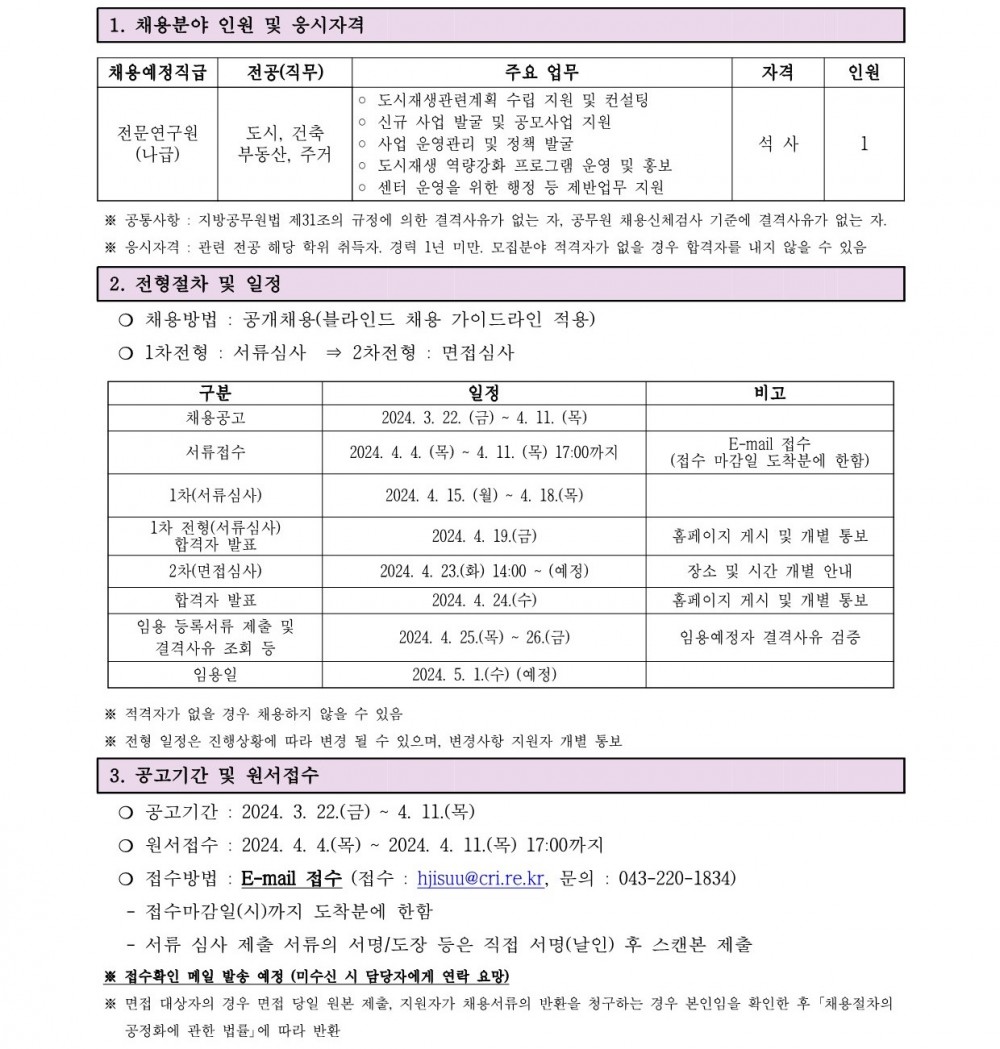 | [채용공고] 충청북도 도시재생지원센터 직원(전문연구원) 공개채용 공고 | |||